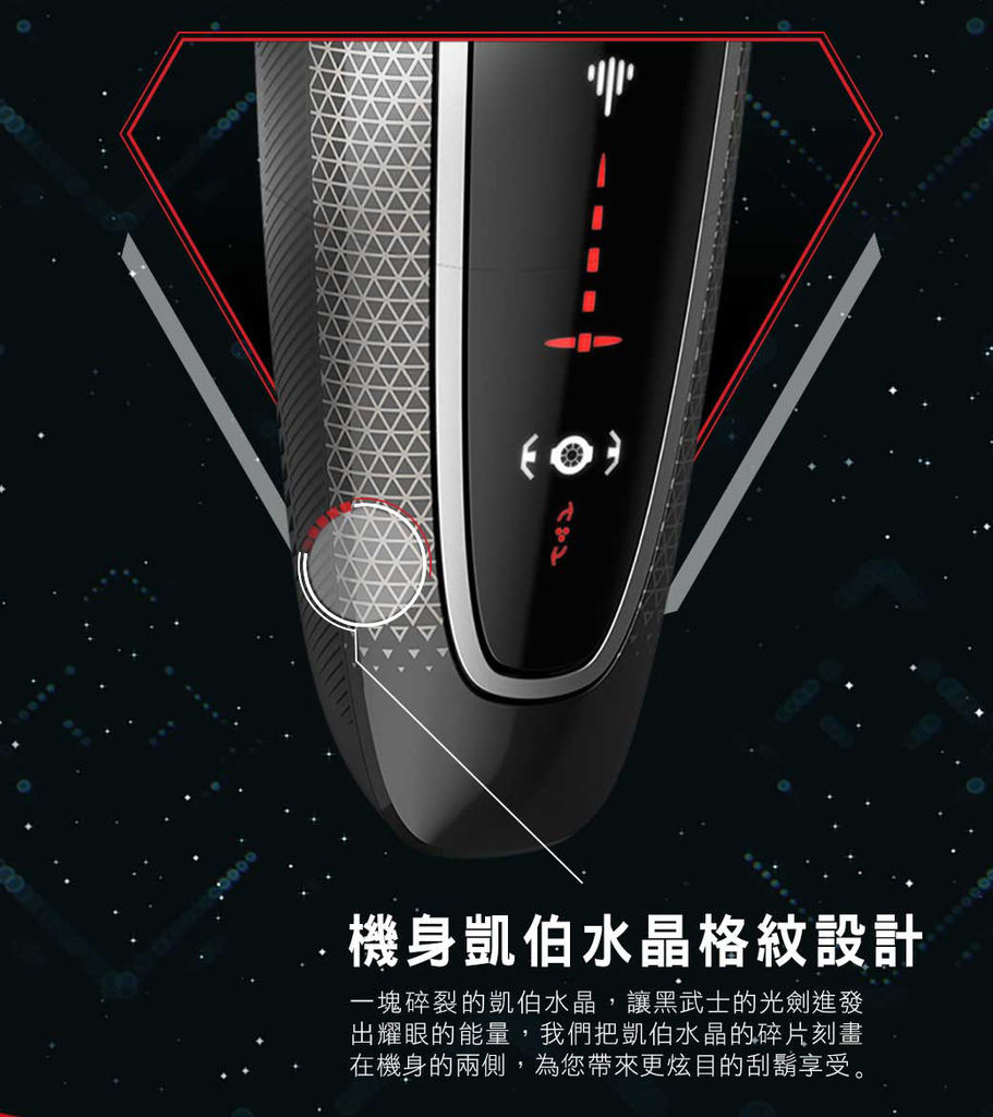 凱伯水晶在星際大戰裡是製作光劍的重要材料,更是原力之源,飛利浦的工藝設計師也把「凱伯水晶」的概念設計加諸在電鬍刀的外型風格上,如此注重細節,星戰迷又怎能不愛!
