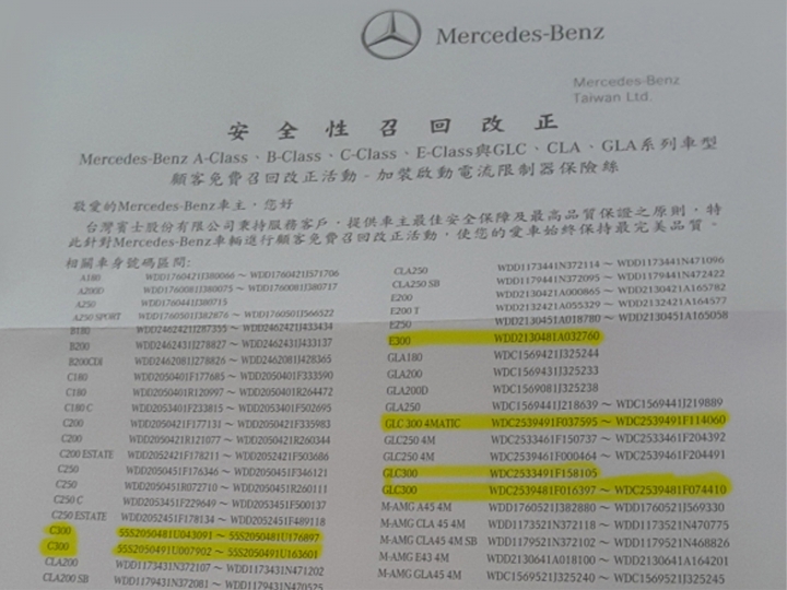 原廠召回實例(賓士車輛因為啟動馬達的限流防護措施有瑕疵)有到台灣賓士登錄的平輸車(美規/ 加規/ 德規/ 日規...)看這裏...首先恭喜榮獲台灣賓士 欽點安全性召回改正第一台GLC300 Coupe 是來自CANADA...第一台E300 Sedan 是來自U.S...收到訊息請儘速回原廠領獎!!!..之前不知那位說召回台灣賓士不會理你???事實擺在眼前不要再 毫無根據 大放厥辭.....