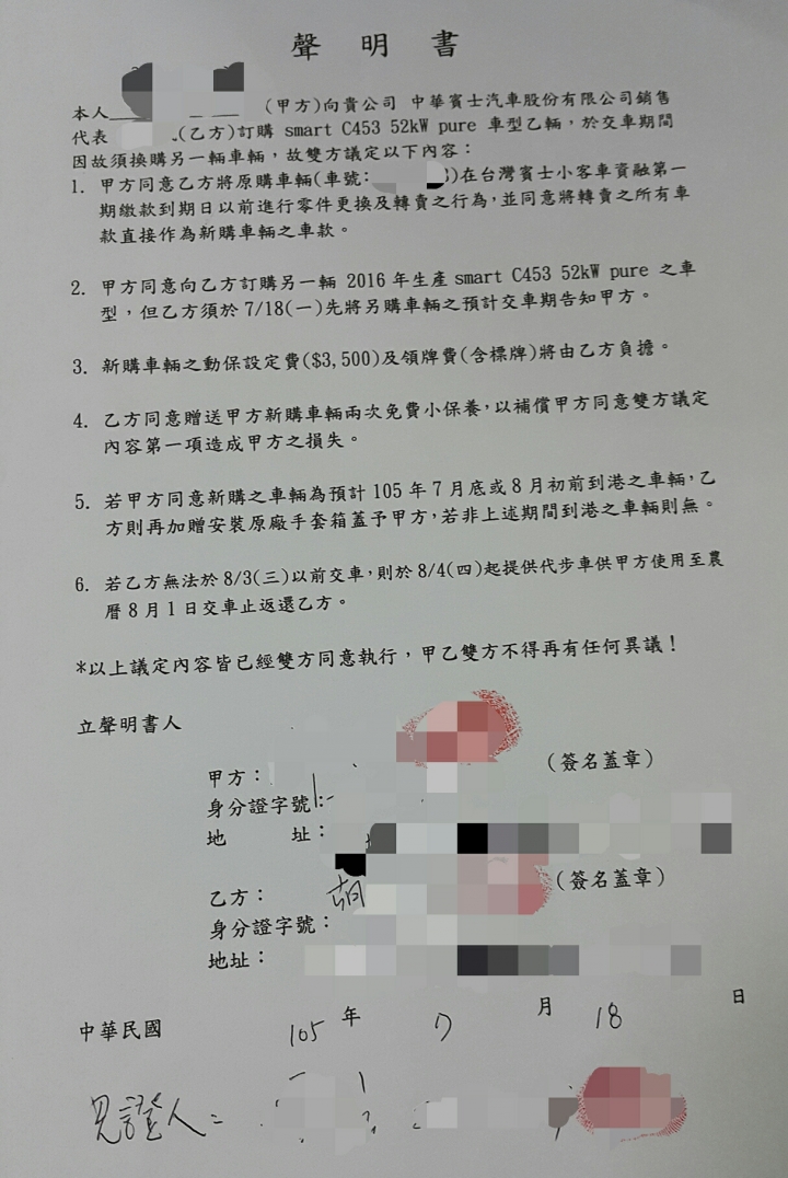 Lion H wrote:我們不是當事者,要有個判斷當然不會只看單方面的說詞...(恕刪) “護航者”,您說的真好,事情確實不能看單方面的說詞。要將車頂凹陷的車換掉拿出來的協議書跟中華賓士一點關係也沒有協議書的甲方寫我、乙方寫業務叫我們兩個簽名這是中華賓士該有的正常作業流程?我是跟中華賓士訂車,又不是業務這樣的做法是想規避什麼責任?你和陳所長之間多好、多順利都不關我的事我就是說出該單位、該公司對於我這案子的處理流程至於是否疑心?當你的錢,入在中華賓士帳戶2個月過程亂七八糟、沒有肯定你也沒關係的話那我就敬佩你囉!言論自由信者恆信