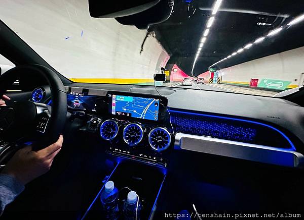 車行至南港隧道,車室暗了下來,儀表版上的氣氛燈格外鮮明,尤其是副駕前的滿天繁星,更是璀璨浪漫,比我現役的坐駕 GLC 200 ,有過之而無不及。但是,此時我們也發現前方塞車嚴重,顯然與我們昨晚 GOOGLE 的狀況大相逕庭,當機立斷更改目的地,下高速公路前往深坑老街。