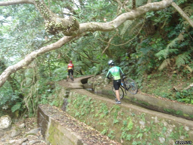 0718~羅斯寫的:唉!!我當時真是好傻好天真~~聽信了人家說從萬溪左線,可以抄近路到平等里~~風景很好,但是要走路走一下下,要扛一車~~我想說,穿卡鞋走一小段路,也沒什麼~~沒想到....風櫃這頭的山景入口扛車下樓梯剛開始還不錯,可以單腳上卡,左腳推地面滑行以下換人拍,因為機子不好,攝影的人也技術不好,所以糊得很大家將祝點看A倫一直鼓吹阿修直接用騎的我還是認份點用舉的還有肩扛還笑得出來(真是不知路之遠近)推車這一掉下去就很不好笑了終於有機會可以滑行一下,但是要全神灌注來到一個小溪口要命喔,大概三十公分寬的路,小心踩上我在想,萬一重心不穩,是要丟車子下去,還是人跳下去 ???繼續前進我還領先登山車喔拍照的人不知道在想什麼 (有楓葉 當然秋天可來看楓紅啊~ 阿呆~)陽光人夫接下來要爬大概三百階跟登山客錯身而過,大家都很熱情地加油抓到難得的機會可以雙腳離地可惜大概只有五十公尺而己最後一小段走在竹林中回到公路了,這兒才是適合小紅的地方
