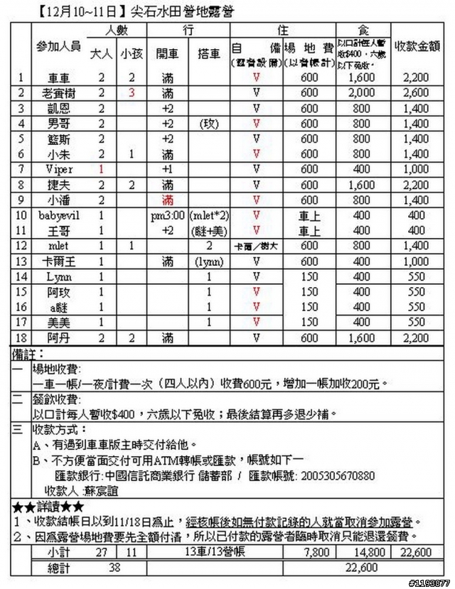 自行開車:1)車車(2大2小)~車已滿2)老實樹(2大)~車已滿3)凱恩(2大)~ 可載2人4)帥哥阿男(2大)~可載2人5)籃斯(2大)~可載2人6)王哥-可以載2-3人7)小朱(2大1小)~車已滿8)Viper-可載1人,歡迎能忍受車舊且四週堆滿雜物者9)捷夫(2大2小)~車已滿10)玲玲媽(2大2小)~車已滿11)babyevil.(1人)下午3:00出發12)卡爾王(2人+二個營帳+二個睡袋+二個睡墊+一堆雜物)車已滿需併車者:1)要開趴的阿玫2)a瞇3)美美04)小潘05)崔崔承租配備:套裝雙人組/$1079:1)小朱2)小潘套裝四人組/$1740:1)車車2)阿玫+a瞇+美美+(輕熟女們、靚女辣妹們請一起來開睡衣趴)3)玲玲媽雙人帳蓬:1)帥哥阿男2四人帳蓬:1)2)六人帳篷:1)2)睡袋:1)2)睡墊:1)2)SORRY因為小E今天才知道12月10日公司尾牙,所以不能參加了