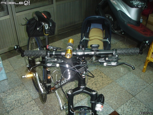 Aska_yang wrote:等了好幾天沒回代打一...(恕刪) 奇怪的組合,聯合國製品....連我都快搞不清楚這部車車到底歸於哪一類型???除了BB請德哥代打安裝外,其餘都是我和Aska完成的....有圖有真相.....車車前面車架照前叉加燈卡夢座管+座墊+後袋龍頭+把手打氣筒+水壺架前大盤+中變+曲柄+會發光的踏板8速32T飛輪+後變有貼小惡魔的車帽G牌小馬鞍袋前燈+前叉線控鎖定開關CATEYE碼表