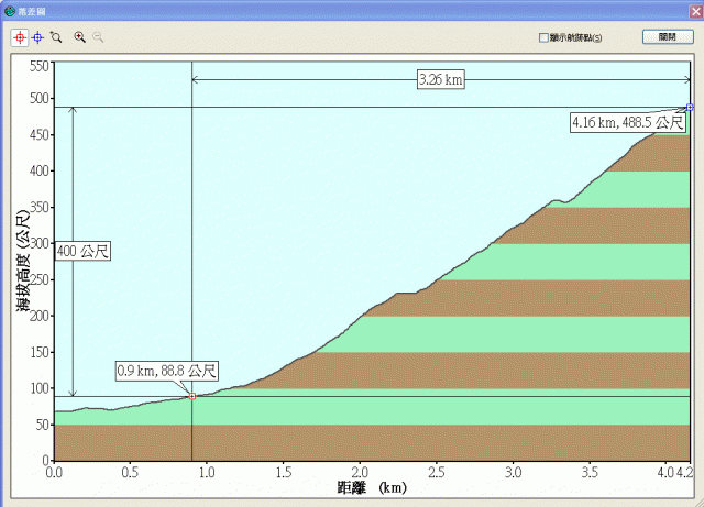 回來了! 變態坡還真是變態, 連續好幾個25%~27%的長陡坡,比中湖更陡還更長, 綿延3公里~~~我的天啊 !都已改騎MTB去挑戰了, 直攻紫微森林居然落地3次, 真丟臉!不過我有兩個心得:1. 最好一口氣不落地直衝, 否則超過20%的長陡坡難助跑2. 卡鞋不要入卡, 為何我會落地? 因為怕定竿摔車!最後就是以不入卡的方式才順利攻上紫微森林, 真慘~~~腿都軟了!落差圖: