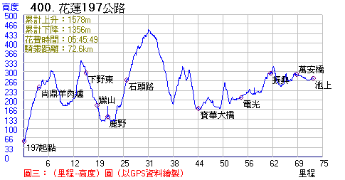 台東197線道的高度圖..http://www.markchoo.com.tw/history/mine-graph.asp?bk_sno=400轉自馬克褚工作室小弟平常騎的大多是從起點騎到下野東前的那一個高點就又回頭..這路線路況不錯 , 車又少 , 風景也還可以..坡度大多是緩坡..比較可以做有氧運動..難怪.........在台東騎比較可以瘦得下來...台中平常騎的路有時都會加上陡坡 , 就變成無氧運動了...ps.奇怪....這整條路線全部都是在台東縣境 , 不知道為何會寫成花蓮197?