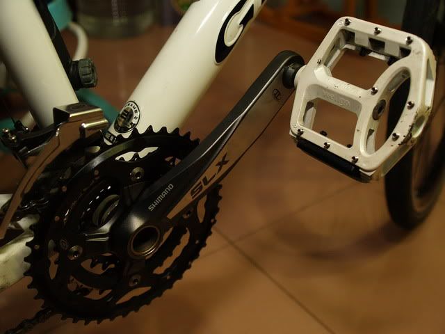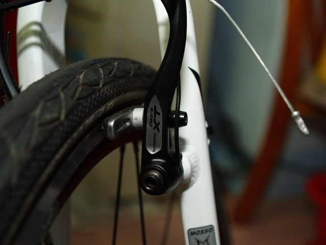 大家都po上愛車照了...換我來po我髒髒的白色se v....背景太雜,全車照就免了,大家也都看過了...只po了一些改裝部份..白色se v登埸21吋車架便宜的白色mosso前叉&德國馬牌 City Contact 26" 1.5 防刺胎白色的水壺架SLX 大盤&白色維格很殺人的踏板XT煞把&雷光M1+&ERGON GX1 (人間肉球)&白色棒球鈴^^XT V煞夾器