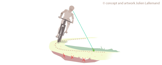 核心技術:轉向轉向看起來很簡單,從你學會騎車後首先會的就是它。然而,在很死的彎或在高速過彎時,只靠你以往會的技術是不夠的。在登山車活動你需要精進你的轉向技巧才能在狹窄的林道舒適且安全地騎乘。進彎要訣腳踏車要轉彎不只是把你的車手把轉動到彎道方向,身體也必須要傾向彎道內側來過彎。身體向彎道內側傾斜是很自然的動作,但你必須熟練這個技巧才能在髮夾彎或高速過彎時派上用場。圖片解說:試著信任你輪胎的抓地力 照片:Shaun Horrocks還記得在講解煞車章節,我們提到重心在你的心臟部位延伸出來一條線的概念嗎?在轉彎時這個概念依然適用,但在這邊重量分佈就不能脫離前後輪接地點的連線上。急轉彎會因為前輪側面對地面的摩擦力而產生類似煞車的效果,與急煞車時相同,急轉彎需要你壓低姿勢,讓你有更多空間去調整轉向程度與控制傾斜角度,你騎得越快,姿勢就要越低。圖片解說: 身體若不向內傾斜是無法順利過彎的看著你要去的方向你的視線方向決定你轉彎的方向,所以盡量看得越遠越好,並且視線專注在彎道的內側,讓你的上身都面向那個方向,把你的頭、肩膀與身體都面對彎道的內側。切進彎道身體稍微離開座墊,並把重量放在彎道外側腳上。屁股離開座墊可以幫助吸收地形的崎嶇(你的腿跟手臂是最好的避震器),轉彎時需要精準的平衡,所以你不希望身體還留在座墊上而受到地形變化的影響。把外側腳放低能提高輪胎的抓地力,身體整體的重心也較低一些,也較容易抓到平衡點,而同時內側腳也因而抬高,避免踏板去卡到地形的突出物。圖片解說: 在路面崎嶇的彎道上,記得讓身體有更大的空間去吸收路面的障礙,不要把內側腳放在下面轉向會讓你減速轉彎越急,前輪受到的阻力就會越大,你不只要面向彎道,還要預期會有跟煞車類似的力道把你向前拋,所以在轉向時,前述章節提過的平衡的蹲伏姿態是重點。實地演練:轉彎• 找一塊無人平坦的柏油路面,兩邊有人行道的路緣,約10公尺寬確認地面是乾淨可提供抓地力的(不要有石礫、樹葉或青苔)。我們要在這邊練習在路面寬度內做180度轉彎。• 找一邊的路緣靠近它騎行,在此假設找右邊好了。• 把你的右腳放低(曲柄是垂直的)並且稍微把你的屁股離開座墊。• 看著左邊的路緣,把你的頭跟肩膀都轉向那個方向,你自然就會朝左邊轉過去。• 把彎道內側的車手把壓低(在此例中是左邊),你在高速或急轉彎時就需要壓低車手把才能順利過彎。• 當你通過道路中心時,把視線移離左邊的路緣,並看著道路的中央。如果你看著路緣你就會撞上去,還記得”看著你要去的地方,而不是你要閃開的地方”這個要訣吧!• 成功了嗎?現在練習另外一邊,從左邊開始。• 大多數人在某一邊的表現會比較好,通常左轉是比較容易的。• 當你學會在兩邊都能成功過彎後,朝另外一邊的路緣靠近兩公尺,再試試看以相同速度過彎,現在彎道的半徑更小更急,你需要更純熟的技巧才能成功。• 持續練習直到你能在兩公尺內完成180度的左右轉彎。• 接著練習較大的轉彎半徑,但過彎速度更快,並加強練習到過彎半徑越小越好。(點圖可放大) 急轉彎連續動作 照片:Shaun Horrocks注意: 如果你在過彎傾斜時拉煞車,那車子就會往外打滑,要盡量避免前輪打滑,所以在過彎時不要使用前煞車,你可以利用後煞車稍微調整你的速度,越快或越急的彎道,就越不能在過彎過程中煞車。演練總結:現在你應該熟練如何進彎,視線應該放在哪裡,以及過彎的姿勢與技巧。並且要學會速度的控制,煞車要在進彎前,不要在過彎傾斜時煞車。