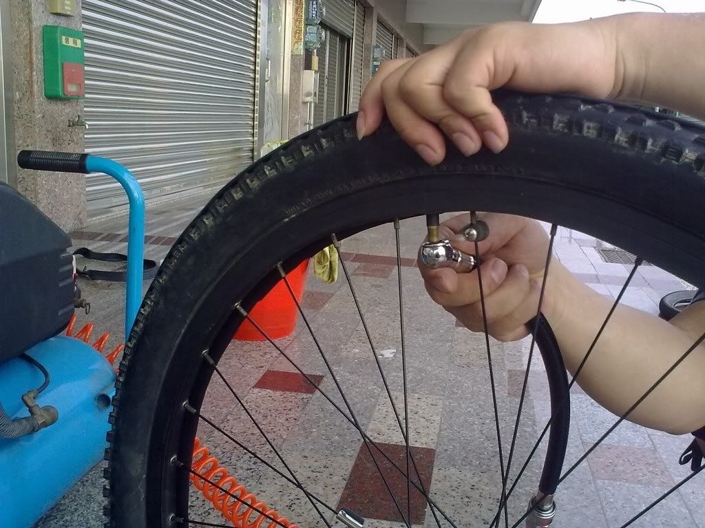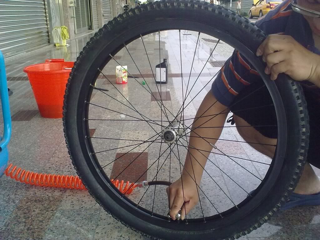 第一個步驟是假組裝,不用補胎劑,先把外胎掛上輪組,然後在胎邊塗上肥皂水 |