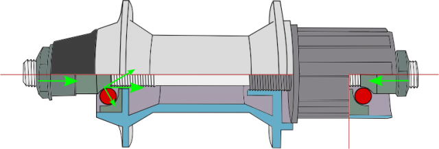 快拆鎖上時,兩端的螺帽會以快拆軸心為支點向內擠壓花鼓的軸心(axel,有人稱為心軸),如圖中綠色箭頭所示。 設計良好的鋼軸快拆,尤其是enclosed cam型式的快拆,在閉鎖之後能對花鼓軸心施加數千到近萬牛頓(newton)的力。 在如此巨大的壓力之下,花鼓的軸心會被擠壓得往內側變形;在此同時,固定在花鼓軸心上的軸承錐(cone)會隨著軸心朝向滾珠和珠碗(cup)擠壓,直接的結果就是快拆鎖上後軸承的壓力增加,因此導致轉動不順。