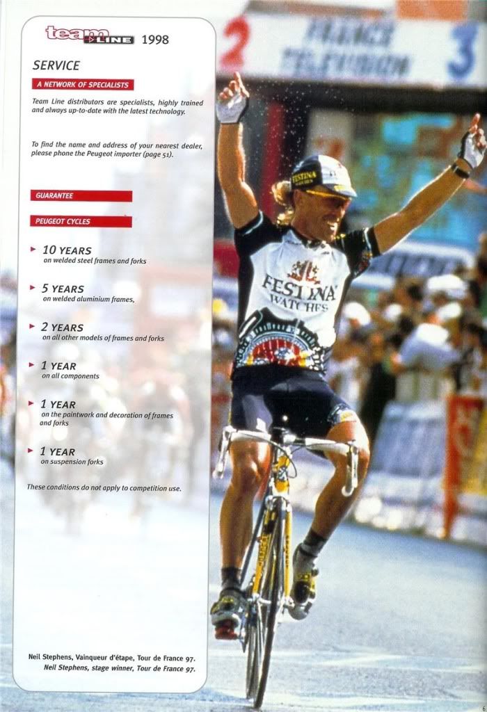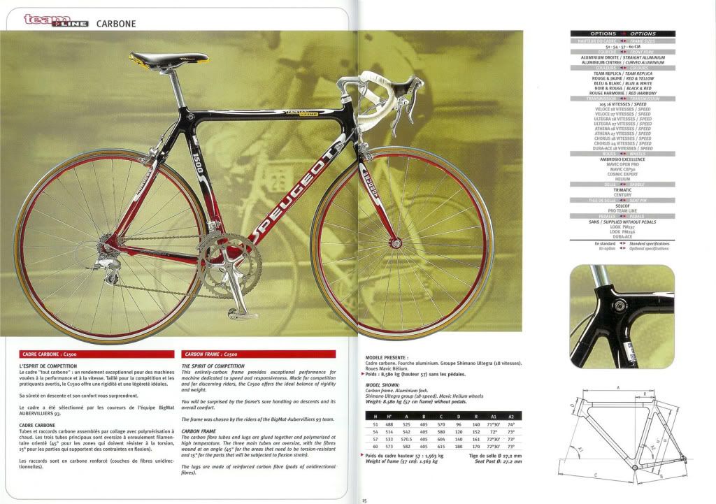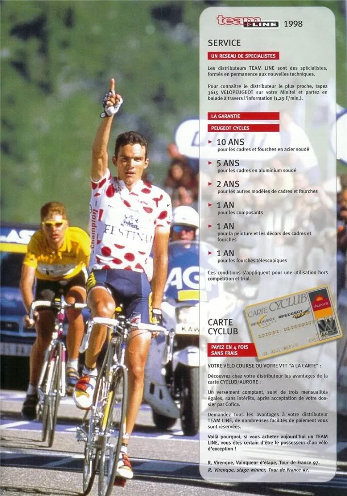 Richard Virenque 騎 PEUGEOT(標誌) TEAM LINE 5000 的風姿真漂亮 , 後邊的車手只有吃塵了 .第1 No.1 很有鬥志和信心另一Festina隊員TEAM LINE 5000 規格只要你騎過標誌公路車後 , 已經很難找到更好了 .我的 PEUGEOT TEAM LINE 1500 CARBONTEAM LINE 1500 CARBON 主要規格十多年的公路車生涯 , 我只保留了這一台 , 可以說這車架是最好的 .