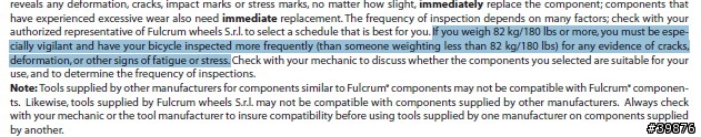 關於FULCRUM跑車輪組官方對於體重的建議我剛剛找了一下FULCRUM官網上的說明書有提到若使用者體重超過82KG要更常保養或檢查輪組Fulcrum說明書我手上2010 Fulcrum Racing 1的說明書也是一樣