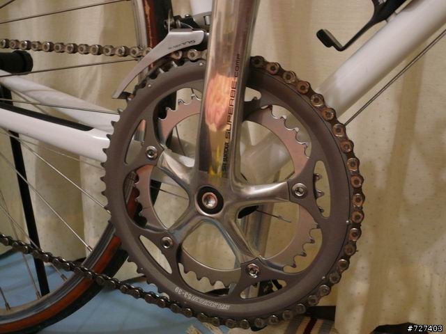 剛整理好一輛從車友接手的老公路車,廠牌不明,昨天才從車行牽回來,換了SACHS後變和SHIMANO不知型號中變、碳纖維前叉+頭碗更新、台製煞車夾器和煞把、台製標準大盤+BB+踏板和飛輪、更新內外胎,線路更新和花鼓整理重上黃油,換新的座管和老式全新椅墊。