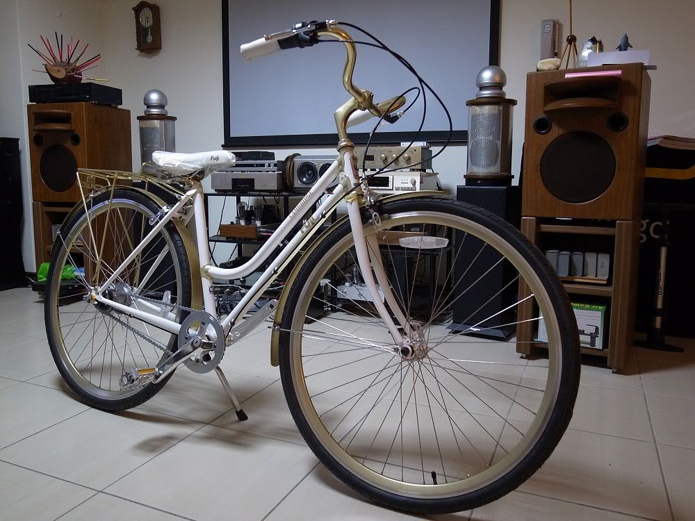 oh yeah!搞定老婆的要求:700c + 平把 + 土除 + 不要太複雜的變速 + 不要手麻/屁股麻 + 低跨噹噹!Fuji Cambridge Lady 金光閃閃 白帥帥啊~我幫他從市區騎回來 超好騎 有鋼管車的Q高碳鋼+lug+低跨+不落鏈的內變+土除,簡直就是我家女王達嫂的perfect坐車!閃到我的Gios compact pro只能靠邊哭泣可以幫他們取名為:藍天白雲嗎?! XD真是你儂我濃~ ^^ 1/28 6am鯉魚潭.壽豐開始連袂出擊!
