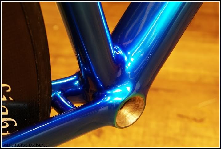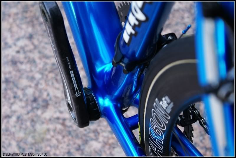 With this new carbon tubeset (it is not a monocoque frame but instead uses separate tubes joined with wrapped carbon technology – making it possible to make any size standard/sloping/custom), Guerciotti claims a weight of 995 grams, including the integrated seatpost. To increase the stiffness of front end, Guerciotti uses a tapered head tube to fit the 1-1/8 – 1-1/2-inch steerer of the new RS Carbon monocoque fork. Custom translucent metallic blue/silver paint makes Gibo’s bike immediately recognizable.