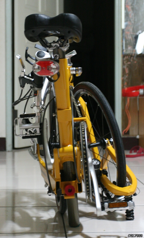 iambenson wrote:請問大大~有20吋折...(恕刪) 昨晚回家拍了幾張,今天上班想上傳竟然記憶卡讀不出來。只好國慶大典後再放上來了。--------------------------- 同樣的讀卡機和記憶卡,換別台電腦竟然就可以讀卡了---------------------折疊後右側看:折疊後左側看:把手和側支架剛好平行閃過。折疊後正面看:輪子用1 1/8 比原廠要細,所以前輪和車架及立管間還有空隙。折疊後後面看:對照背後的門框可發現有點傾斜,但不會倒下。不過印象中原廠的好像也有點斜。換了仿Paul的夾器後,原廠的煞車就不行了。改換這支煞車皮長度比原廠的要多出三分之一,煞車力道就強多了。FOLEX 20吋輪組馬牌1 1/8外胎