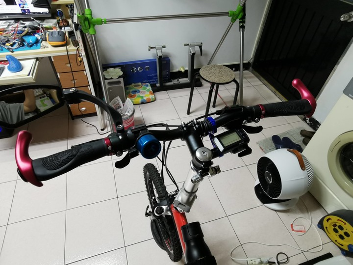 回家後立馬進行換把先是擺上去看看拆下平把擺在地上比對,把寬是一樣的換上去的樣子,還好變速和煞車線都還夠長,不需要重新拉。整車的樣子,家裡東西多,所以背景有些雜亂。新把比預期來的早,所以把帶還未來得及買,再後補吧!近來也因為自己常騎長途(60~80公里),平把真的用起還蠻累的,即便有牛角也是,因為沒辦法變換姿勢,導致右手掌大拇指有點腕溝症出現,剛好在登山車版看到Surly Bar的討論,所以就乾脆換上去吧!接下來,就等假日試車了。