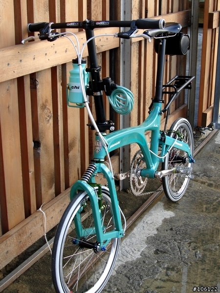 峰哥....我的2009 Bianchi Fretta已經改的差不多了,目前銀彈不足,所以大盤還未改,暫時用 RC2 拆車品先頂一下還有後貨架&Bianchi 原廠車鎖還沒裝上,另外PAUL原廠夾器送去陽極還沒回來,所以先貼照片解饞一下,全車照類PAUL夾器陽極綠色,前鍍鉻彈簧150%,日本Bianchi 原廠水壺架+日本Bianchi原廠水壺CHRIS KING 前+後手工編製輪組+20"拋光銀輪圈+SRAM PG990飛輪+HOPE 快拆XTR後變+防掉鏈勾爪Bianchi 立體頭標 + 綠色 CHRIS KING 頭碗XTR撥把+XTR煞把+人間肉球+CONTROL TECH 碳纖直把BROOKS Swallow ti 鈦弓 坐墊以上好像都是鳥車的制式裝備,沒啥創意!這台改的目標是走有點走向輕量,因為我還有一台BD-1 ti +Rohloff "重"裝版兩台車定位不同,這台是走平路+遠距。而鈦鳥定位是山路+短距離所以我的第六部鳥車暫時改到這樣,因為沒錢了!!對了! 小王的"經典鈦鳥"改的如何? 想了解一下進度!記得有空到高雄約騎一下喔!!