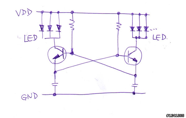 啊你怎麼不考慮用兩顆電晶體加 RC 構成震盪電路,負載端直接驅動 LED 就好了,不要用 inverter 去湊 ring oscillator,那很麻煩咧。