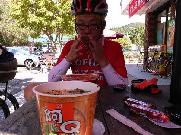7-11大補給,還是來一碗泡麵好了。泡麵又油又鹹,熱量也不低,適合我們這種整天亂跑的傢伙。上次400K自從在淡水吃了一碗泡麵後就不再抽筋了...