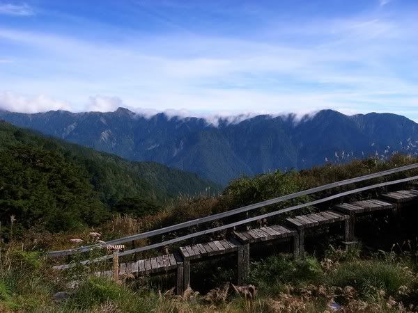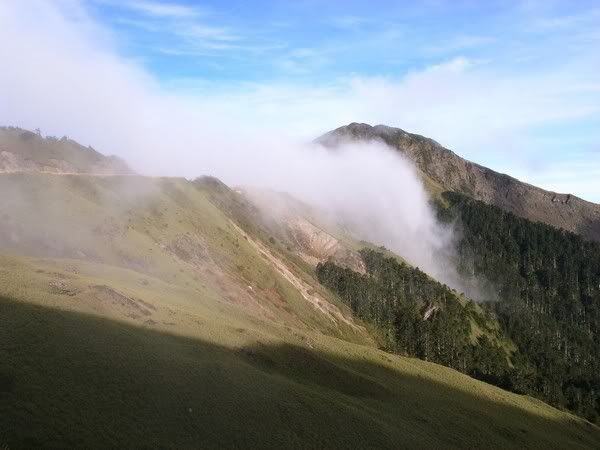 這時武嶺那邊似乎起了一陣大雲瀑,相當壯觀。 想想我們今天運氣真是好。一般來說山上中午以後就開始陰天,我們到了下午四點都還是大太陽,還有此等美景,夫復何求。