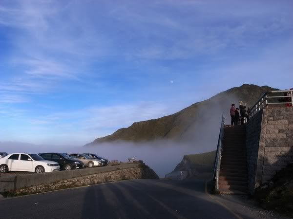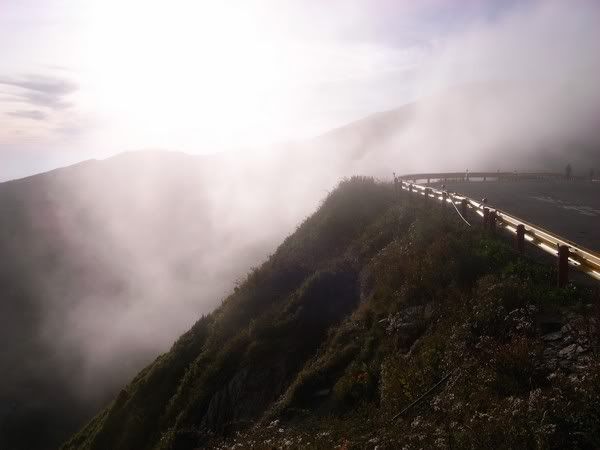 在前方穿過了雲瀑後,我到了。最高點終於到了。身旁四週雲瀑一直亂噴,但武嶺亭週圍30公尺卻沒有霧。非常神奇。
