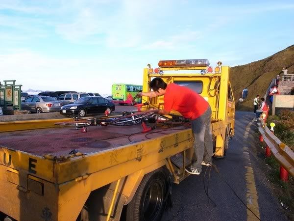 Paul的外胎因為出問題,所以已經沒辦法再溜了。所以我們也請好心拖吊車載我們下到埔里。先把車子五花大綁...