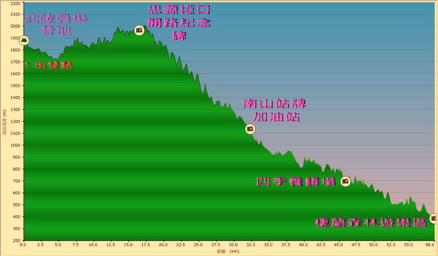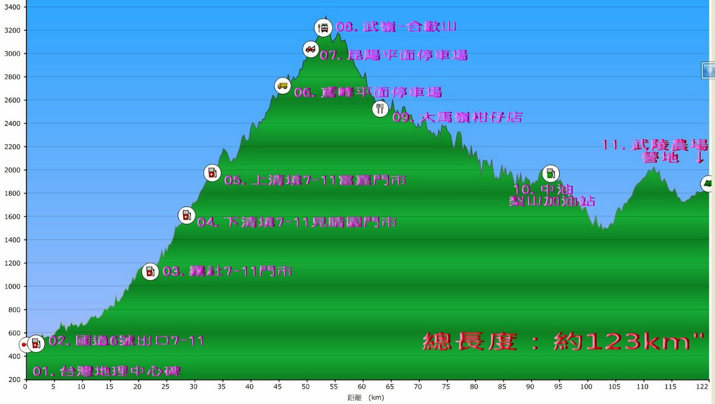 阿璋你得好好休息調整體力嘿~!!06/12你還得參加高鐵團的["年度糜爛大戲"]~~"瘋武嶺,玩武陵"哩!! 下面是 埔里地理中心碑→武陵農場的[*等高圖*]給你參考一下!! 加油!!第一天的等高落差圖圖片想看大張一點,請點這裡 ← ←第二天的等高落差圖圖片想看大張一點,請點這裡 ← ←我想帶著單車到這裡拍照