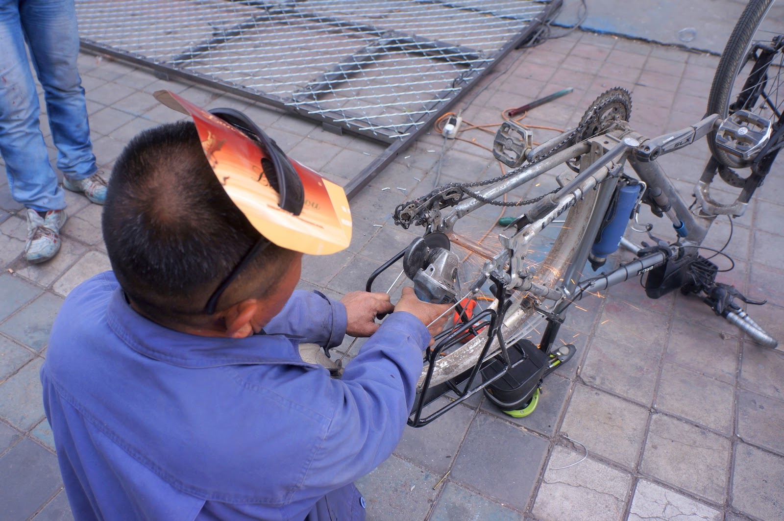 師傅看了看這麻煩的問題後,拿起電鑽就直接給那節死賴著的螺絲一個迎頭痛擊。整台單車就像待宰的羔羊一樣趟在地上,看著各種工具輪番上陣,用得火花四溢,想不到一大早就有這麼火爆的場面上場。瞧師傅鑽得架式一副輕鬆自然,但看在我們眼裡可是膽顫心驚,深怕他有任何閃失連這台車也沒辦法騎了...
