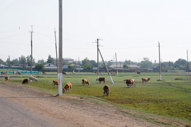 來到一個有成群乳牛在吃草的村莊,跟著電線桿我們進到一個感覺頗大的村莊。第一件事就是先找路人問哪裡有買東西的地方,雖然在哈薩克每天都還是會經過一兩個村莊,而有村莊就代表有商店,但經過大戈壁之後已經養成準備糧食的習慣。
