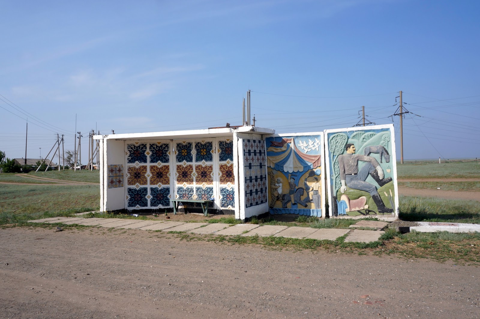 上路後四周的風景依舊草原無邊,但經過的城鎮明顯變多了,顯得更加熱鬧起來。每一個村莊除了會寫上地名之外,還會用一些圖案設計來搭配代表這裡的地方特色,有的會用動物、有的用盾牌長茅,但不管怎麼設計其實都脫離不了一個元素─哈薩克藍。