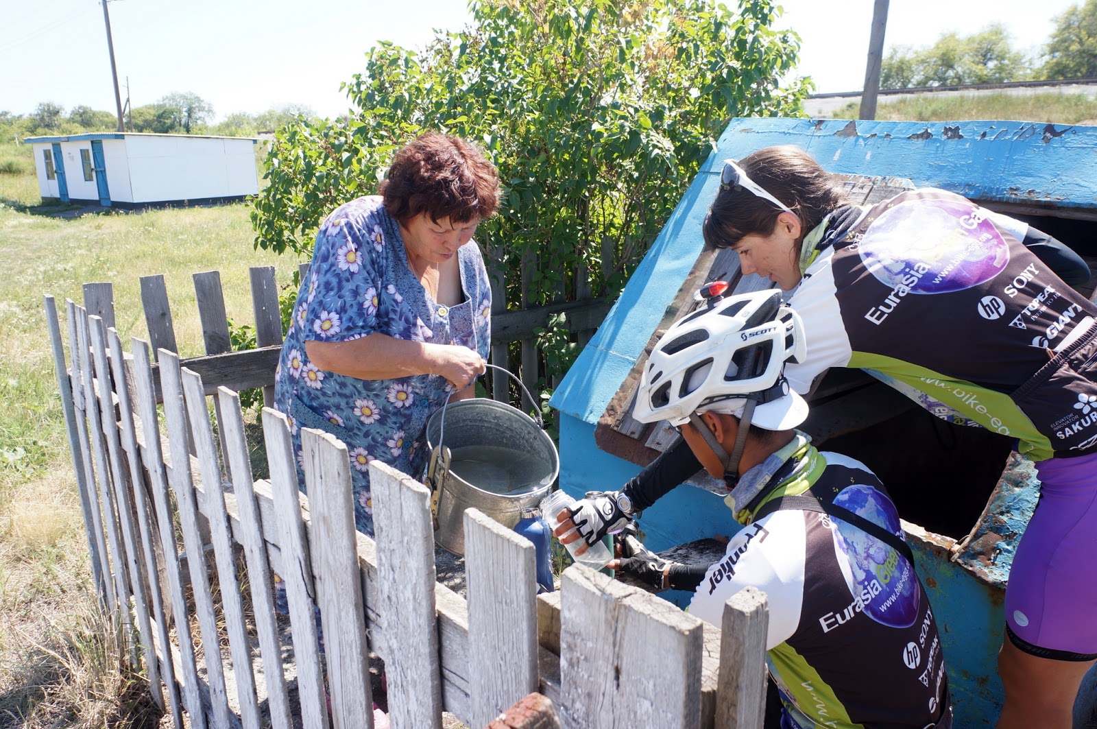 一戶人家看起來有人在,但好像只敢偷偷望著我們而已。最後一家有看到人車進出,觀察後感覺像是鐵路工人的住所,哈薩克已經碰到兩天網上發生突發狀況,所以對於這一類的場所還是避免來得好。最後在我們對面的這一家,有一位老奶奶提著水桶出現了。