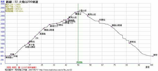過橫嶺山隧道口後28k,即是著名的國家級大雪山森林步道入口,由此經鳶嘴山2130m---稍來山2307m----船型山2274m----鞍馬山2666m--到達小雪山莊,步道計約16.6km,約需10小時才能走完。沿路景色必定是美不勝收,以後若有機會一定要去走走看看。