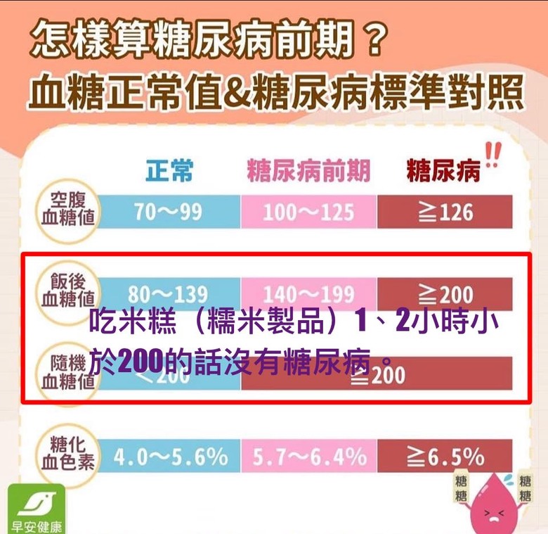 周建安進一步說,血糖偏高也不用太過緊張,因為唯有當飯前血糖大於126mg/dL,飯後血糖大於200mg/dL,而糖化血色素大於6.5%才叫糖尿病。另,若飯前血糖為100-125mg/dL,飯後血糖為140-199mg/dL,及糖化血色素為5.7-6.4%則為留校察看族群。
