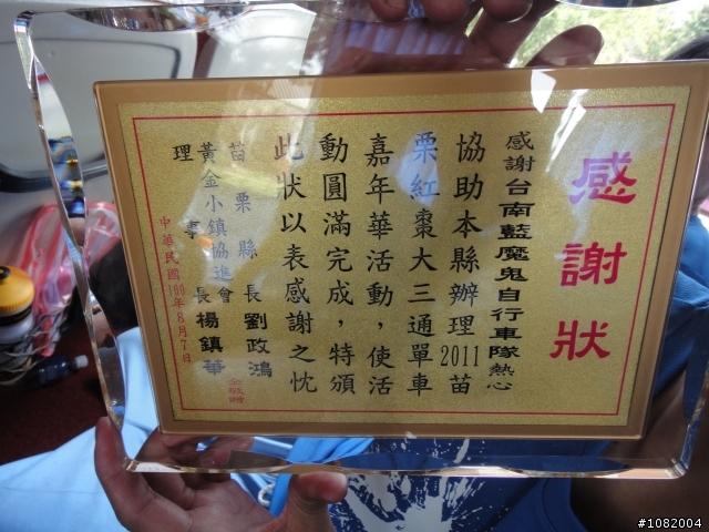 樓上的筱涵很偷懶喔!!2011-08-07 - 『公館紅棗「大」「三」「通」』一早,三點就起床準備今天的行程,由於某位車友臨時無法成行,故我搭上末班班車,今天準備要來去苗栗騎車囉!!到了集合地點已經有大約6-7位在等了,大家對於長程的活動都很有準時的觀念到集合地大夥開始使用藍魔鬼團購攜車袋包起今天準備陪大家長征的愛車↓↓↓↓遊覽車來囉,大夥準備上車↓↓↓↓找好位置後,與兩個月回來一次即常常幫我外帶的國文拍個照↓↓↓↓上車後,由於時間還早,大夥便繼續睡了起來,等到醒過來的時候已經到達苗栗,到了苗栗不禁往外看,好多正妹唷~ 到了出發點,遊覽車先停下讓我們放車,開始組車,準備前往會場↓↓↓↓哇,今天的完成獎”座”,也是我看過最有誠意的了,每個獎座上面的名字都不同喔!↓↓↓↓出發前亂照,藍魔鬼又開始在吃客家鹹粥,一邊吃還一邊嫌芋頭太硬,真不愧是我們的專長↓↓↓↓亂拍↓↓↓↓今天聽說有三千多位參加哩,等台上的長官們講完話就開始囉↓↓↓↓今天藍魔鬼+OPEN獎+幸運草+皇嘉共報名了3X個哦~人數實在是太多了小小DC沒廣角很難拍啊,只好分兩張拍↓↓↓↓退後退後退後,終於拍了一張完整的,不過人好小喔!請自己找看看自己在哪啊~等大家都走光了,我們才慢慢往出口走↓↓↓↓小龍不知道在正經啥米?不知情的可能還會以為是辦啥米事情喔!!!↓↓↓↓接著大夥接連的出場囉~一出門就是大概1%-2%的緩坡,不過苗栗山區真的不錯比起182的酷熱,還蠻涼的↓↓↓↓很快的經過10KM來到了汶水老街,只是太早了,都還沒開哩,於是就隨便拍一拍就閃了↓↓↓↓獸肉店,不知道有沒有賣瘦肉精XD↓↓↓↓繼續上路,苗栗的山區景色↓↓↓↓在路旁看到泰山溫泉的標誌,一群人浩浩蕩蕩的跑過去對向拍照,這時已經差不多是最慢的團體了↓↓↓↓繼續往前騎,發現一顆超大的草莓,當然……還是來拍照啊!! 首先,偷拍每次都辛苦照相的阿得↓↓↓↓草莓有多大?就是這麼大!!!↓↓↓↓楊桃有多大?就是這麼大!!!↓↓↓↓西瓜有多大?就是這麼大!!!↓↓↓↓這時剛好有電視台的訪問,當然把老闆推上火線啦!!↓↓↓↓看我吃草莓↓↓↓↓啊…實在是太受歡迎了,第二家電視台又來訪問↓↓↓↓好囉,拍完照,路還是要走的…藍魔鬼傳統,要好好的排隊,有紀律↓↓↓↓到了爬坡點,薑麻園,開始大約6KM的爬坡,這時候已經快9點了,天氣很熱,阿輝說薑麻園跟烏山差不多,但是實際上騎完之後,烏山還是難多了,烏山多轉折大彎,而且重點是烏山整路都沒有樹蔭可以遮,薑麻園騎起來還蠻涼的。↓↓↓↓到了第一補給點,有仙草茶,粉條,香蕉,補給品還蠻多的↓↓↓↓在這邊遇到喬巴軍團-地球防衛軍於是就一起閒聊了起來↓↓↓↓聖衡殿的景色↓↓↓↓閒聊到吃起冰來了,到此時都還覺得多麼的美好啊~↓↓↓↓慢慢聊天順便等人,在想說小哲怎麼都沒上來,結果他小朋友沒啥休息就跑向第二休息點去了也沒人知道,就在這邊傻傻的痴等了30分鐘….. 小哲醜一在出發吧,接下來就是一連串的下坡了齁齁齁~天氣開始變熱了!!認識我的都知道我很怕熱,於是就沒拍照,進度就這麼快了起來第二爬坡點↓↓↓↓最後終點前陸橋↓↓↓↓終點前3KM等待大家一起進終點↓↓↓↓啥米啊~後面45KM才8張照片啊!!是的~變熱了之後,我就不拍了…..要看照片請找其他人拍的吧~自行腦補吧!科科~結論:1.苗栗是個練車的好地方,多山路,多樹蔭,10點前騎起來蠻舒服的。10點之後就跟台南差不多熱了。不過台南7點就開始熱了,XDD。2.特別感謝苗栗在地車隊(苗栗縣自行車協會)-甲子車隊的先生,幫我們載了好幾次,還協助我們順利將洪銅大哥送醫院及接送車輛到會場,實在是太感謝了!!3.此次洪銅大哥不小心摔傷了,需要開刀治療,希望洪銅大哥好好休養,早日康復,要傷好了在出來騎車喔,不要太心急了。