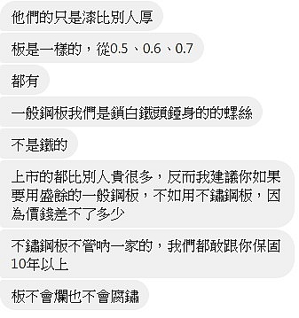 鐵牛CEO wrote:材料 你可以要求盛餘0...(恕刪) 0.6跟0.5會差很多嗎?當初廠商是跟我說0.5就夠了GC0173260 wrote:其實用鋁鋅的可以撐個20...(恕刪) 有這麼久哦,我家鐵皮不到20就鏽成那樣了....所以我這樣算貴了點嗎? 24萬?說真的第三張那張A4寫的估價單看的不是很懂...求解釋為何他白鐵只要17萬