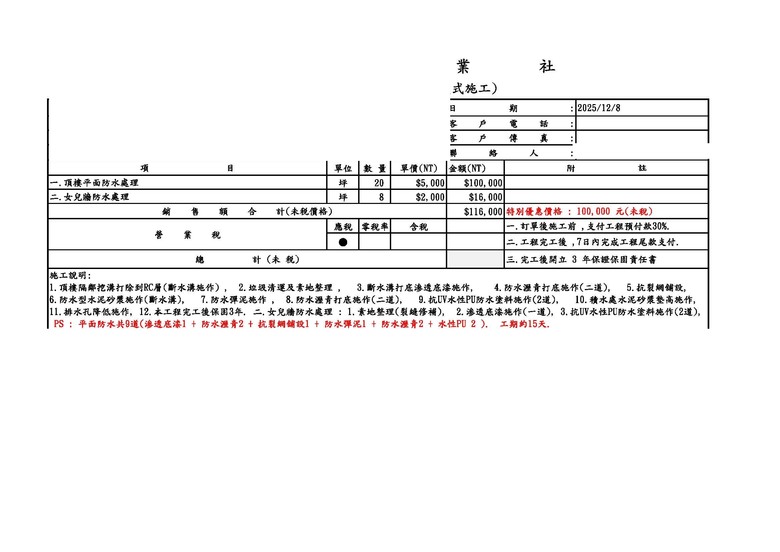 最近看中意一間社區12樓頂樓房,但因為是頂樓的關係怕以後會漏水需要重做防水,房仲是說可以抓一個費用讓他去跟屋主殺價,因為沒有認識的施工單位可以了解,上網估狗了一下,好像因為施工的方式不同價差差滿多的,如果以比較好的防水工法去估的話,大約現在的行情是會座落在多少?(坪數約50坪)