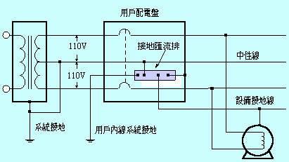 為了防止感電發生,配電盤內的中性線端子盤,和接地線之端子盤應短接在一起(請事先確認這兩極之間之電阻是否小於 1,如小於1 表示已在電表處短接,此點就不用在短接了,如果再把它接上會形成接地迴路),才能夠在器具漏電至外殼時,即時將斷路器斷開。 因為當器具漏電至外殼時,會經過接地線回至配電盤,此時之迴路電阻極小,一般小於1歐姆。假設為 1 歐姆, 110/1=110A,迴路過載,NFB斷路器會跳脫。
