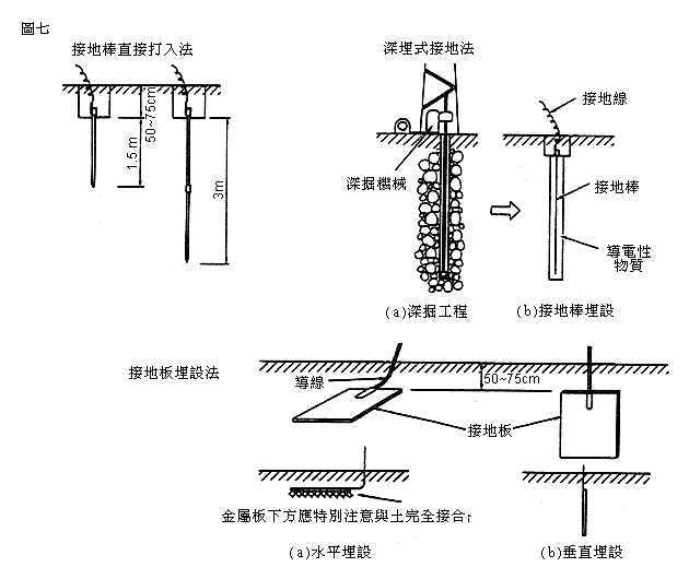 (三)接地板埋設法:金屬板以水平或垂直之方式約 50~75cm 深度埋設,埋設時特別注意金屬板必須與土完全接觸,以確保導電性。