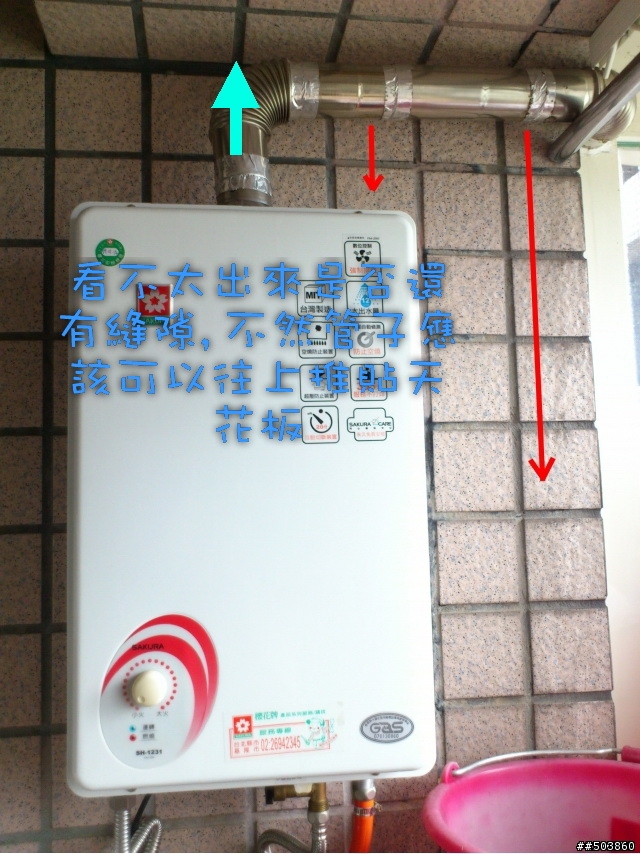 這台熱水器已經裝了六年左右由於排氣管的設置角度以致於一下雨雨水就會漏進屋內在漏水處的下方裝有水桶接水想問一下這方面的專家及先進這樣熱水器會不會故障、燃燒不完全或是根本就沒燃燒直接漏氣!?如果想要改善的話是不是要改變排氣管的角度!?或者是無解!?有圖有真相~紅色箭頭是漏水的路徑白色箭頭是水順著排氣管進到熱水器的路徑