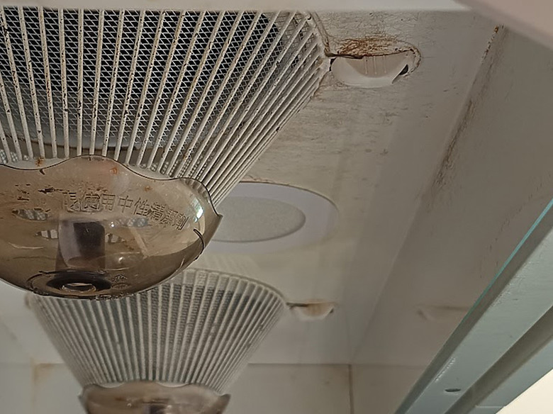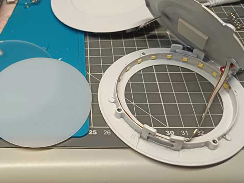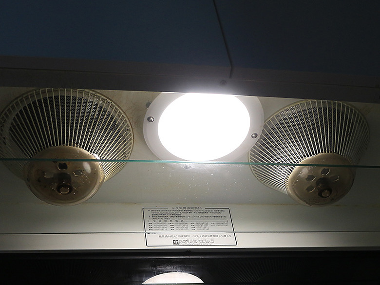 我家的櫻花R9506CXL,是LED燈。也就是中間內部那一圈塑膠圓盤,用螺絲鎖上去的。原廠的大概在400元上下。壞了以後,我買了一個環狀的便宜LED燈片,背面有磁鐵吸上去。欸,要會簡單焊接兩條線。用一陣子,白光不太習慣。 而且有點暗。我就想,什麼燈,用量大,所以便宜?崁燈啊。可是機身原本的開孔太小崁不進去,只好,也用磁鐵吸在上面。凸出來醜醜的。而且.....太亮了。倫家本來是裝天花板的,現在放在小小的空間裡,當然太亮。後來我在淘寶用那個孔的尺寸去找,居然有適合的。目前就一直用這款了。就這個超薄型的LED崁燈,適用孔徑直徑大約9cm。問渠那得薄如許?拆開一看並不稀奇。類似於LED螢幕,燈珠在周圍,用背光板與導光板讓光線照出來。