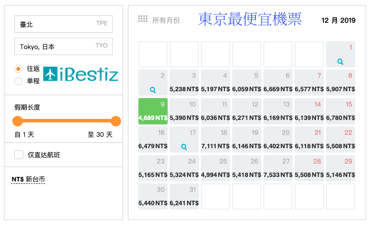 這是我近期在網路上發現的機票比價網,最讓我驚奇的一個優點就是,你只要輸入要前往的國家,它可以一秒讓你看到12個月以及每日最優惠的機票價格,你可以按照您的出發時間訂購到優惠機票!