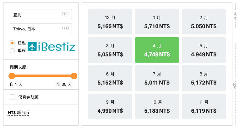 這張直接讓您找到12個月份機票價格表,以目前來看,明年4月機票價格最便宜!
