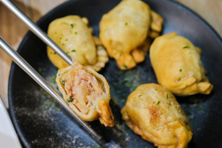 用打拋豬肉餡包餃子後下去油炸,皮薄餡多的一道料理