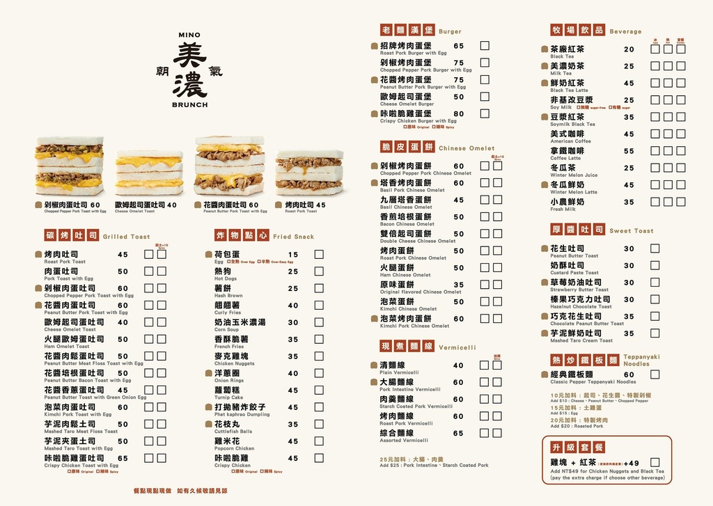 先來看看菜單,小米聽朋友的推薦,一早就決定好要吃他們必點的脆皮蛋餅跟剁椒肉蛋吐司