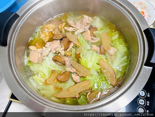 麻油杏菇雞當然不只可以用來產後補身,最近天氣轉冷,我們也想自己補一補,老婆提議用它當鍋底來煮火鍋,我當然舉雙手贊成。從冰箱拿些常備的火鍋料,再加點高麗菜,就可以開煮了!