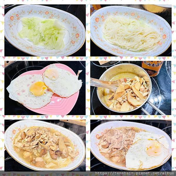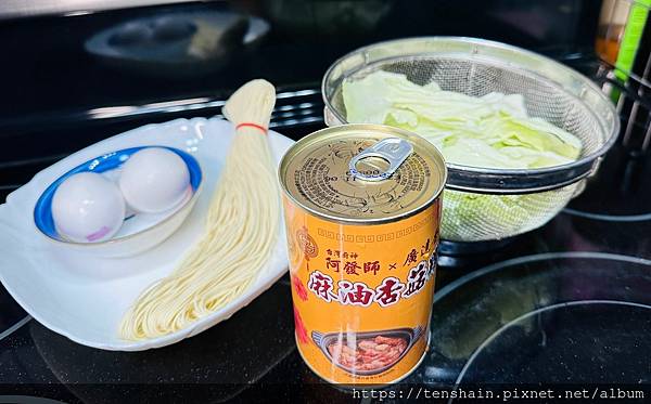 首先燙好高麗菜,接著把麵線煮熟,再煎兩顆荷包蛋備用。打開麻油杏菇雞,煮滾後倒入碗中,再鋪上荷包蛋,就大功告成!
