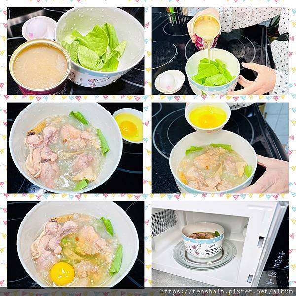 這次我想更懶一點,微波爐直接加熱,就能搞定一餐。首先將洗好的青菜撕碎,鋪在碗底,然後倒入人蔘糯米雞罐頭,再打顆蛋,均衡營養增加豐富度。接下來,整碗放進微波爐,設定好時間和功率,按下"開始鍵",一切搞定!
