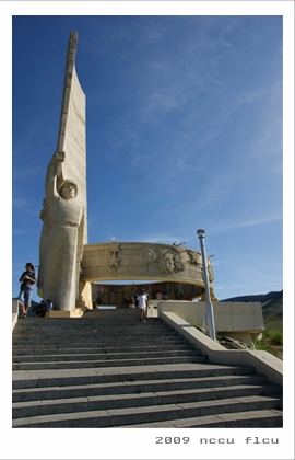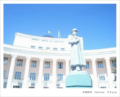 位於市區中心的蒙古國立大學(Монгол Улсын Их Сургууль)的主樓,前方是喬巴山元帥(Хорлоогийн Чойбалсан)的雕像,喬巴山元帥是率領蒙古獨立的領導人之一。蒙國大是幾棟建築物,不同的學院在不同棟上課,沒有圍牆也不是完全集中在一起,這點倒是跟台灣的大學有一整塊校地蠻不一樣的