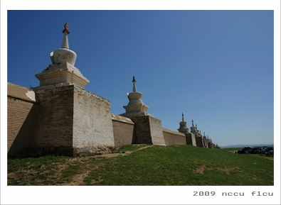 哈喇和林(Хархорин),位於烏蘭巴托的西南方,成吉思汗在1220年下令建造此城,但在其死後才建造完成,在忽必烈遷都北京以前,一度是蒙古帝國的首都。十六世紀的時候,因為藏傳佛教傳入,蒙古的第一座佛寺─額爾德尼召寺便選在故都哈喇和林建立。哈喇和林的外牆是108座的純白舍利塔,進入裡面以後發現,寺廟其實只佔其中一小部分,大部分都是荒煙漫草,這次學校請了英文的導覽員解說,也因此不再只是走馬看花,對於藏傳佛教又多了一點認識。但來到哈喇和林的觀光客明顯比慶寧寺多許多,哈喇和林外甚至有一整排的紀念品商家