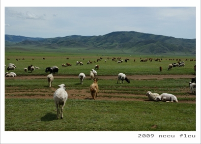 但也因為這樣,有了很多特別的體驗。沒有指示跟路標的草原路,完全就是靠司機的經驗來前進﹝因此也有走錯路的可能性…﹞。一但車子進入了郊外,兩邊的道路就是綿延不絕的草原草原草原還是草原﹝遠處還可以看到山﹞,不時還可以看到羊呀牛呀馬呀之類的在路旁,雖然看久了實在有點沒變化,但還是很美麗的 :D